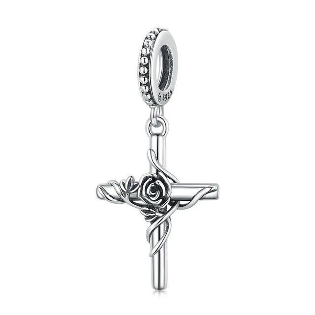 Срібна намистина "Хрестик та троянда"